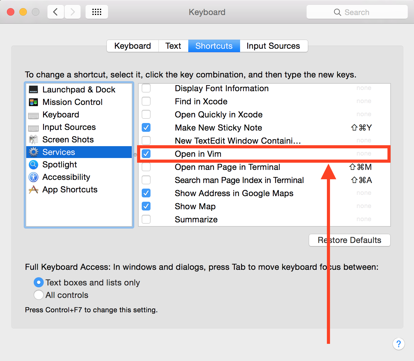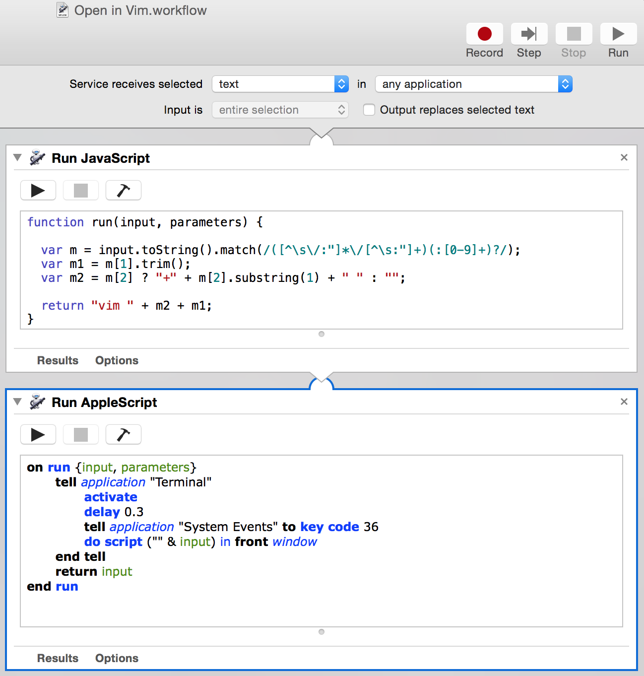 It's an Automator (that robot icon) service, saved under the name "Open in Vim" that chains a Javascript and an Applescript piece of code.